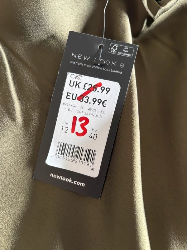 The New Look Khaki Satin Midi Skirt is available in sizes M.