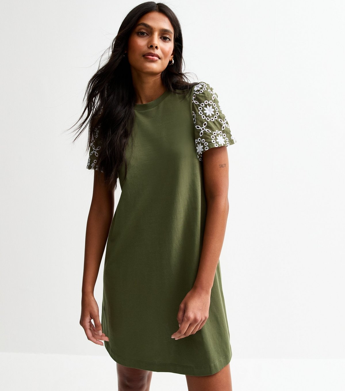 The New Look Dark Khaki Broderie Sleeve Mini Swing Dress is made from jersey.