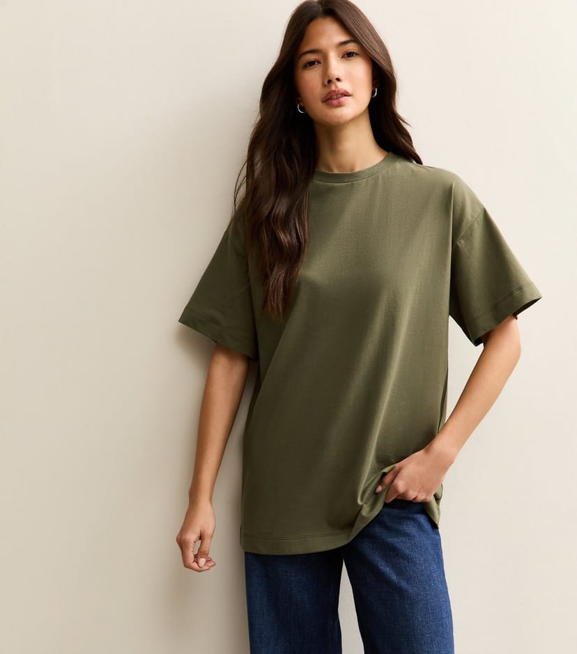 The New Look Dark Khaki Oversized Cotton T-Shirt is available in sizes 10, 12, 14, 16, 18, 20, 22, 6, 8.