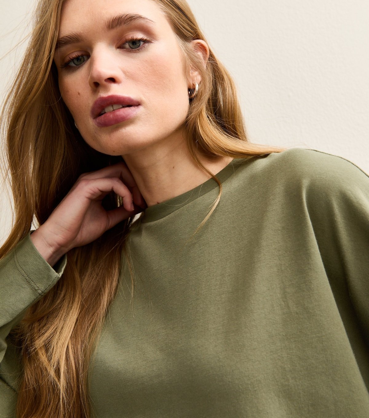 The New Look Dark Khaki Heavyweight Cotton Long Sleeve T-Shirt is available in sizes 10, 12, 14, 16, 18, 20, 22, 6, 8.