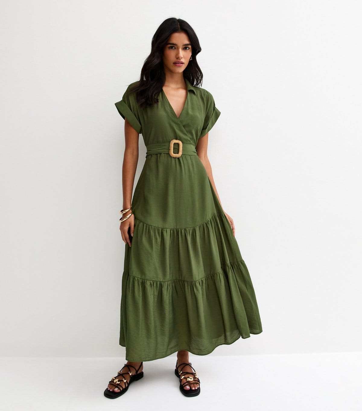 The New Look Dark Khaki Tiered Belted Midi Dress is ideal for work, casual, weekend.