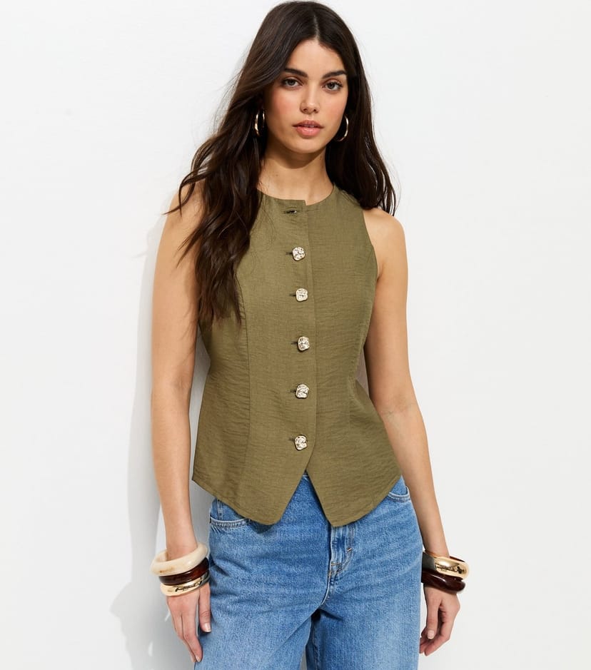 The New Look Khaki Textured Buttons Waistcoat is made from woven.