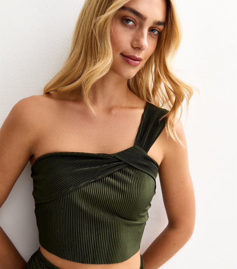 Elegant khaki plisse one-shoulder crop top by New Look. Features a slim fit and intertwined design for a modern twist. Ideal for evening wear.
