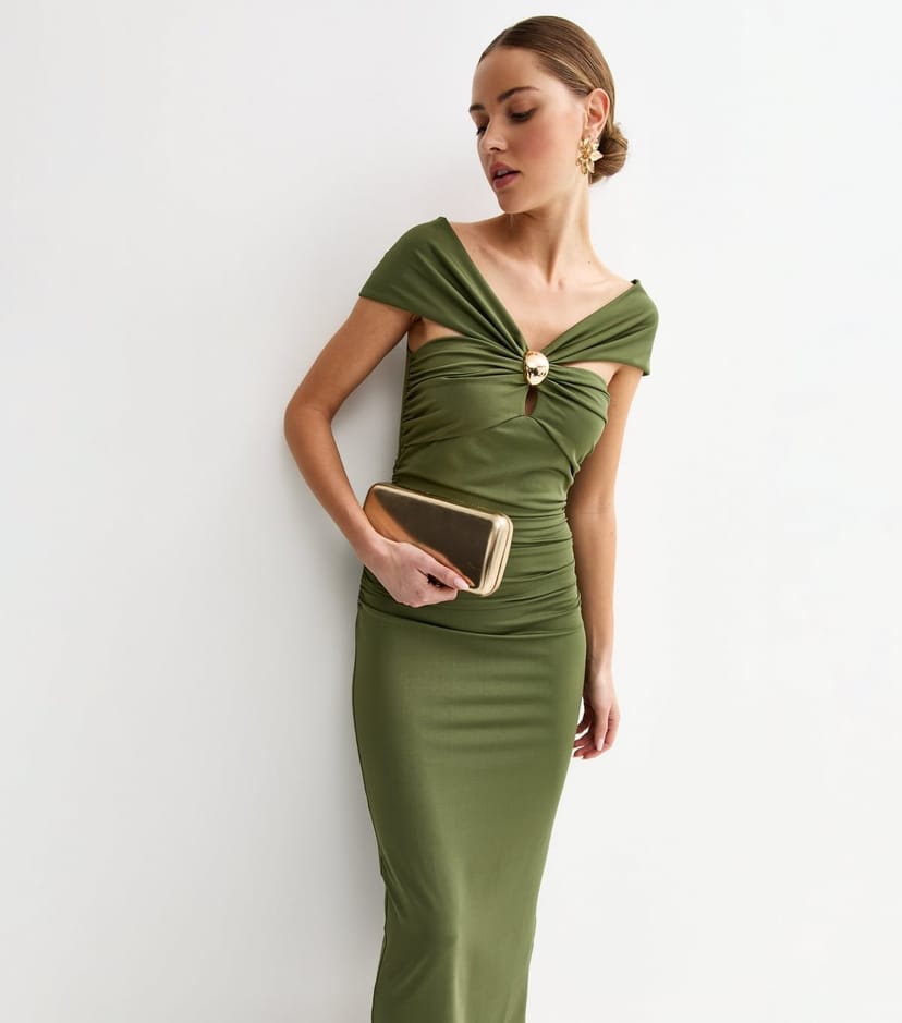 The New Look Khaki Jersey Off-Shoulder Midi Dress is ideal for evening, party, date-night.