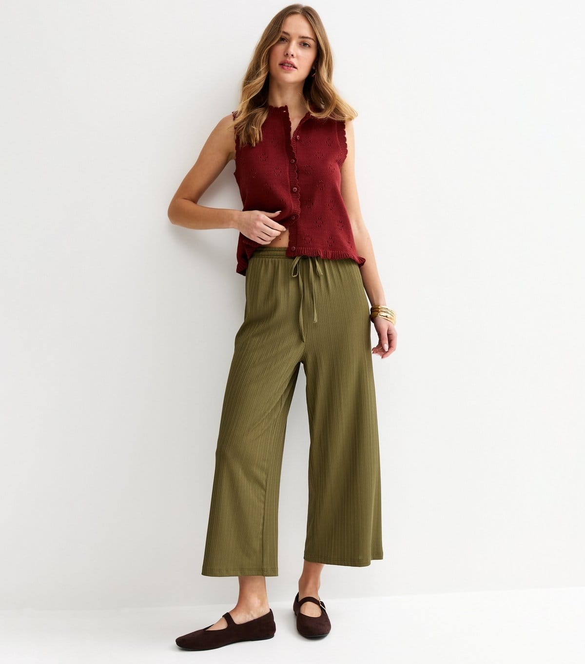 The New Look Khaki Ribbed Cropped Wide Leg Trousers is ideal for casual, everyday, outings.