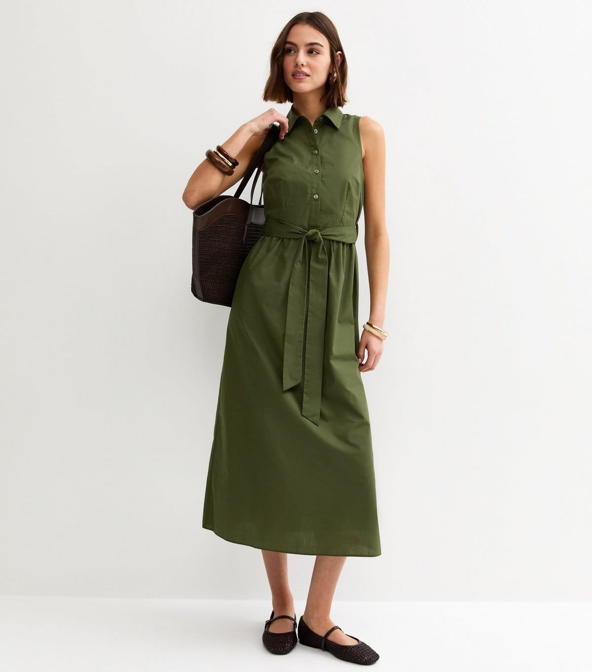 The New Look Khaki Sleeveless Midi Shirt Dress is made from woven.