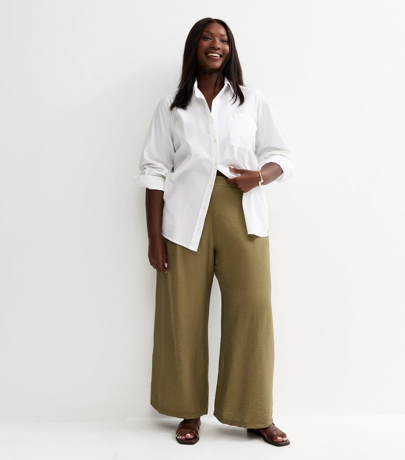 The New Look Khaki Crinkle Texture Wide Leg Trousers is available in sizes 18, 20, 22, 24, 26, 28, 30, 32.