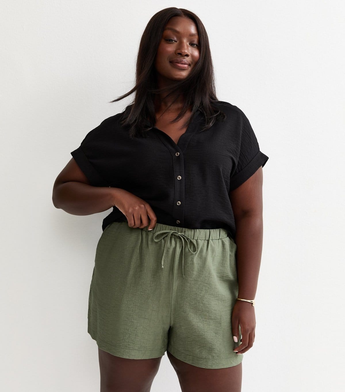 The New Look Khaki Crinkled Drawstring Shorts for Women is available in sizes 18, 20, 22, 24, 26, 28, 30, 32.