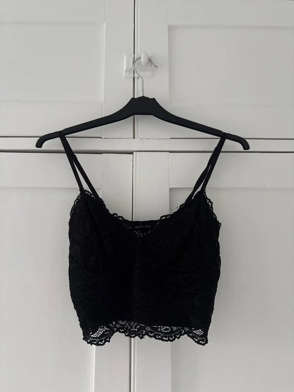 Stylish black lace cropped cami top from New Look. Features a scoop neckline and adjustable straps for a comfortable fit. Perfect for layering or as a standalone piece.