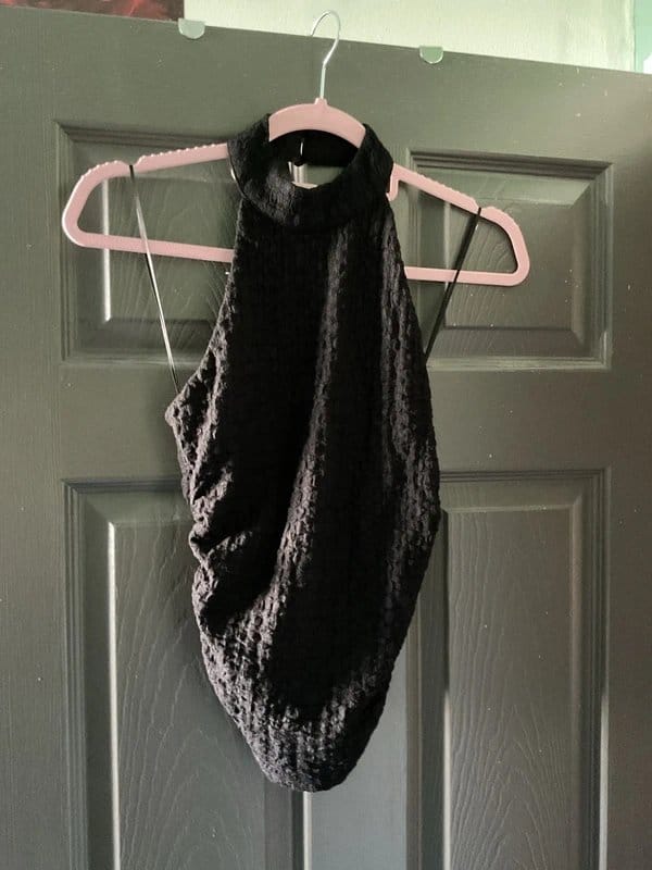 Stylish New Look halter neck top in black. Made from a stretchy fabric with a crochet-like texture, this top features a strapless design and a high neckline. Ideal for casual outings or layering.