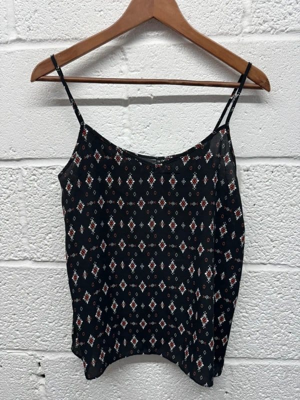 Stylish New Look camisole vest top in black and red with a geometric print. Features a scoop neckline and adjustable straps for a comfortable fit. Perfect for casual outings or layering.