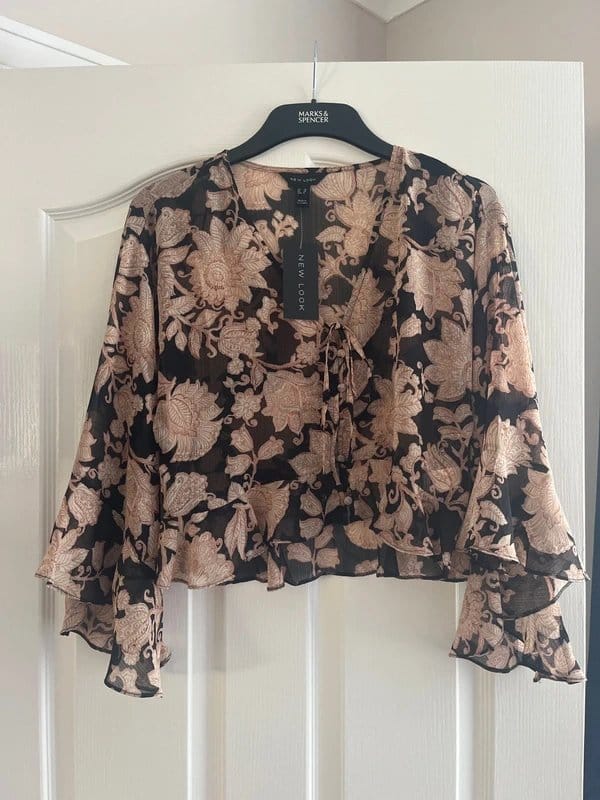 “Pair with high-waisted black trousers and strappy heels for a stylish evening look.”