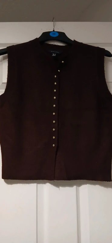 This burgundy knitted waistcoat from New Look is sized medium, featuring gold effect buttons. It is in excellent condition and perfect for layering.