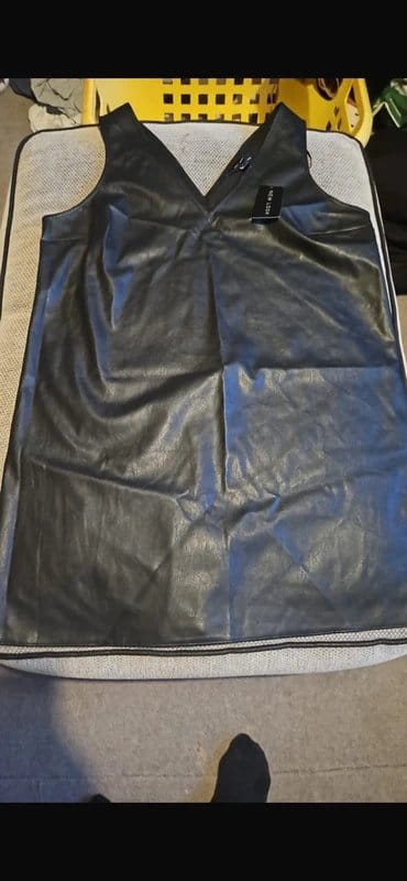 The New Look Black Leather-Look Sleeveless Dress is available in sizes L.