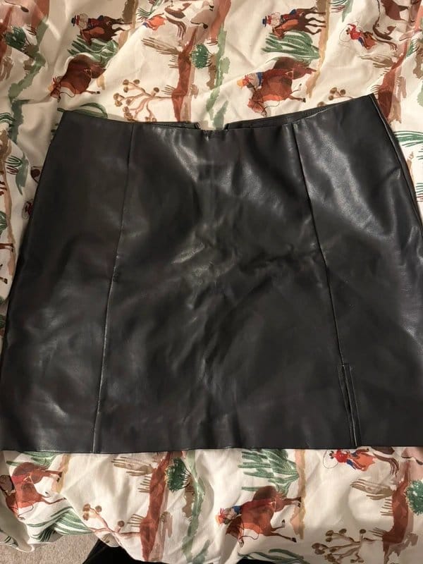 Stylish black leather mini skirt from New Look. This skirt features a sleek, leather fabric with a zipper closure and side slits for added flair. Perfect for a casual or evening look.