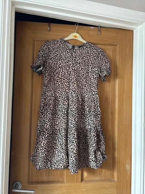 The New Look Brown Leopard Print Tiered Smock Fit Dress is available in sizes S.