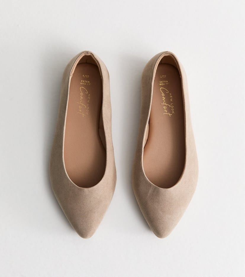 Versatile light brown faux suede pointed pumps from New Look. These elegant shoes feature a neutral shade and extra-wide fit for comfort. Perfect for a simple yet elegant look.