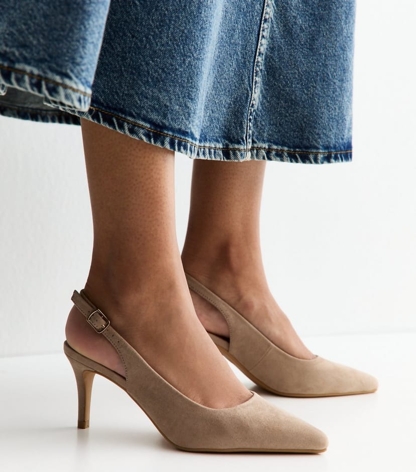 The New Look Light Brown Faux Suede Slingback Pumps is available in sizes 5, 6, 7, 8, 9.