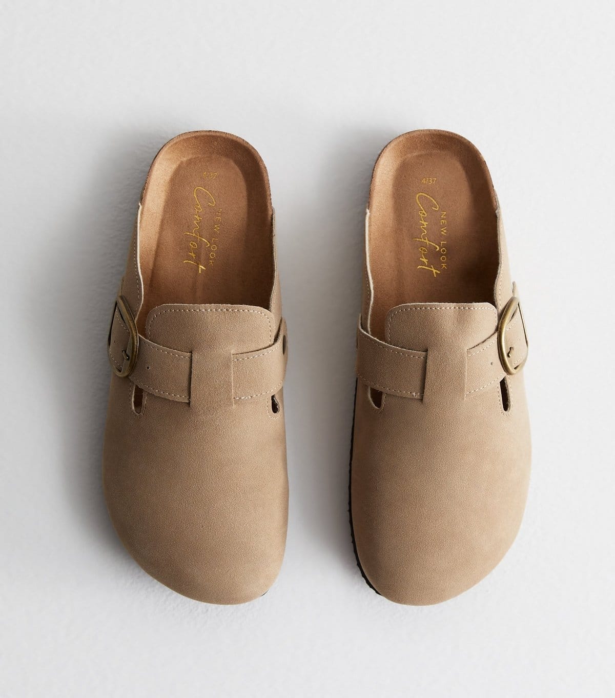 Stylish and fuss-free, these light brown suedette mules from New Look feature a rounded toe, buckle detail, and a slip-on design. Perfect for comfortable everyday wear.