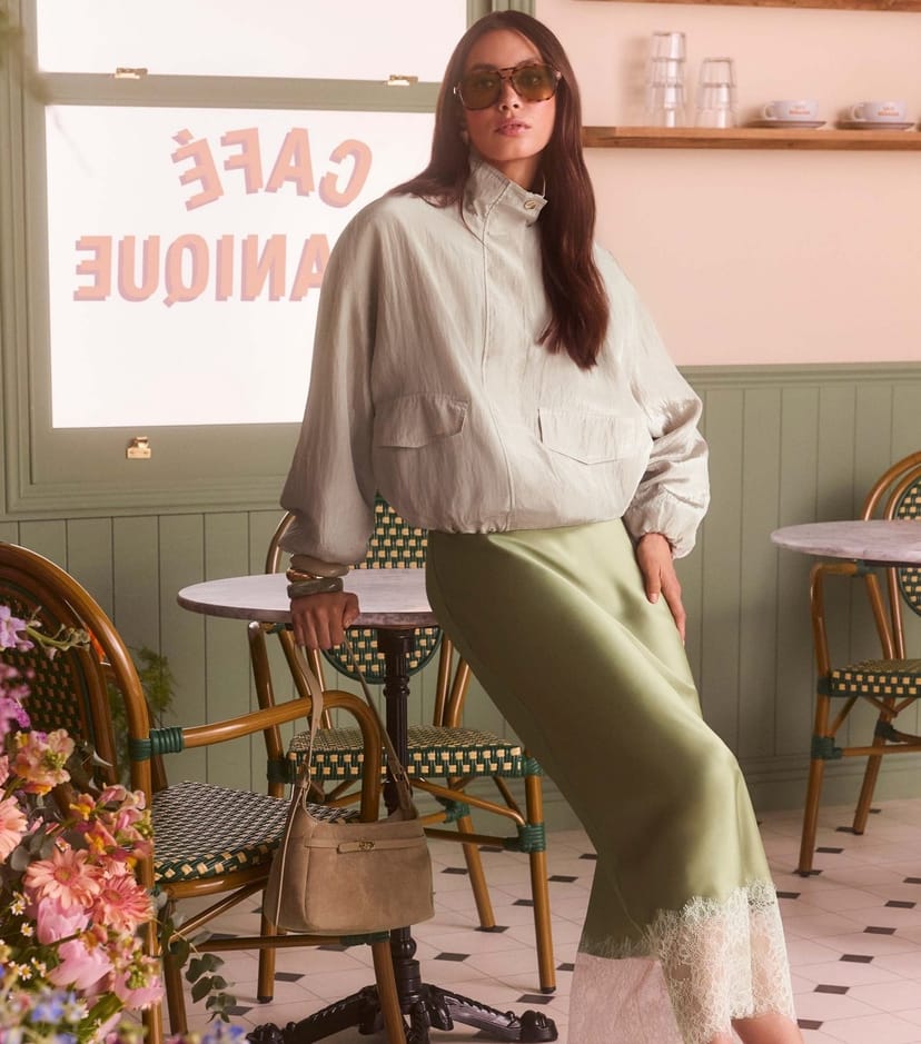 This light green midi skirt from New Look is an effortlessly chic choice. It features deep sheer lace panels lining the hem, perfect for pairing with basic tees or cami separates for dressy occasions.