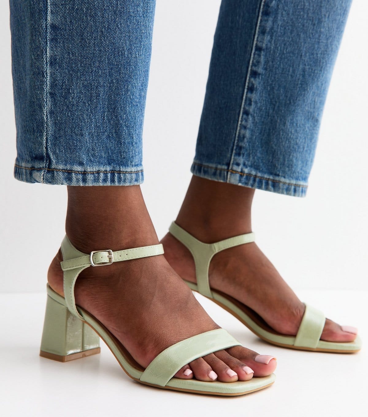 The New Look Light Green Faux Leather Block Heel Sandals is available in sizes 3, 4, 5, 6, 7, 8, 9.