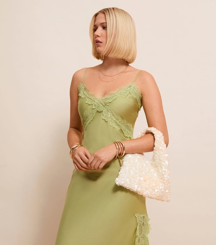 Elegant light green satin slip dress with a deep side split and lace trim. Features a V-neckline and adjustable thin straps. Perfect for evening events or date nights.