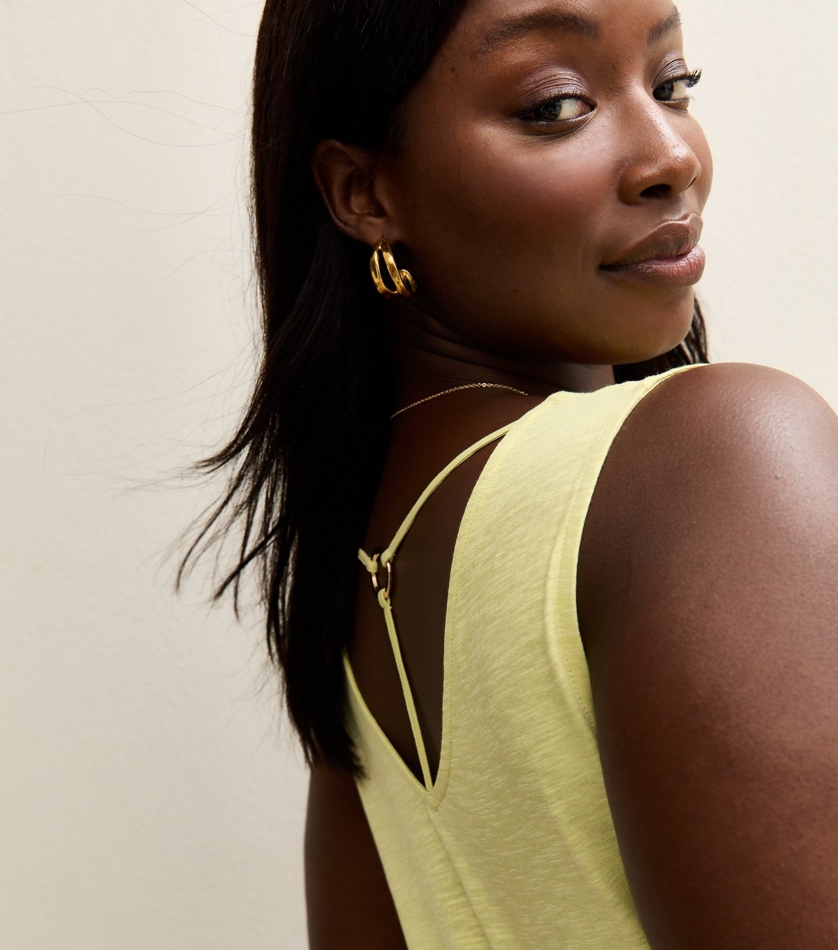 Refreshing light green jersey vest with a V-neckline and a strappy back featuring a shiny O ring. Designed for a relaxed fit, it's perfect for summer.