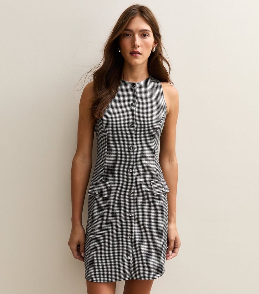 View New Look UK's returns policyChannel preppy vibes in one simple step with this black checked pinafore dress. The slim mini length buttons up at the front and has decorative flap pockets.