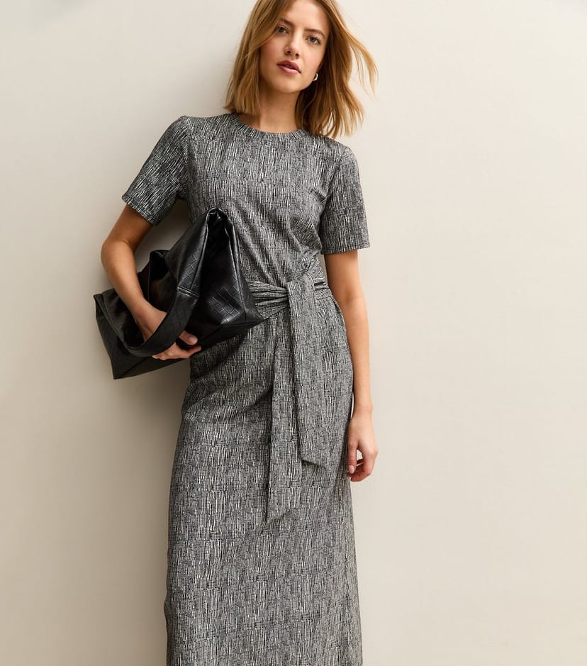 See all outfit ideasThis light grey midi dress is cut to a casual T-shirt silhouette and features a tree bark print. The short-sleeve style also boasts a tie belt across the front for a draped finish.