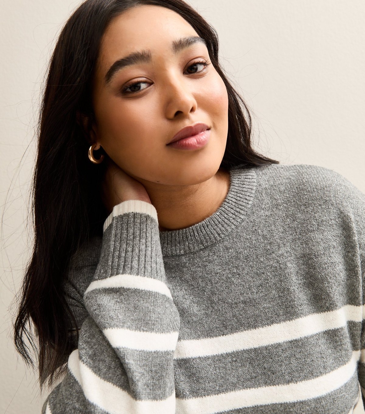 A plus size wardrobe essential, this light grey jumper from New Look is knitted with contrast stripes for a stylish look. Perfect for relaxed and casual moments.