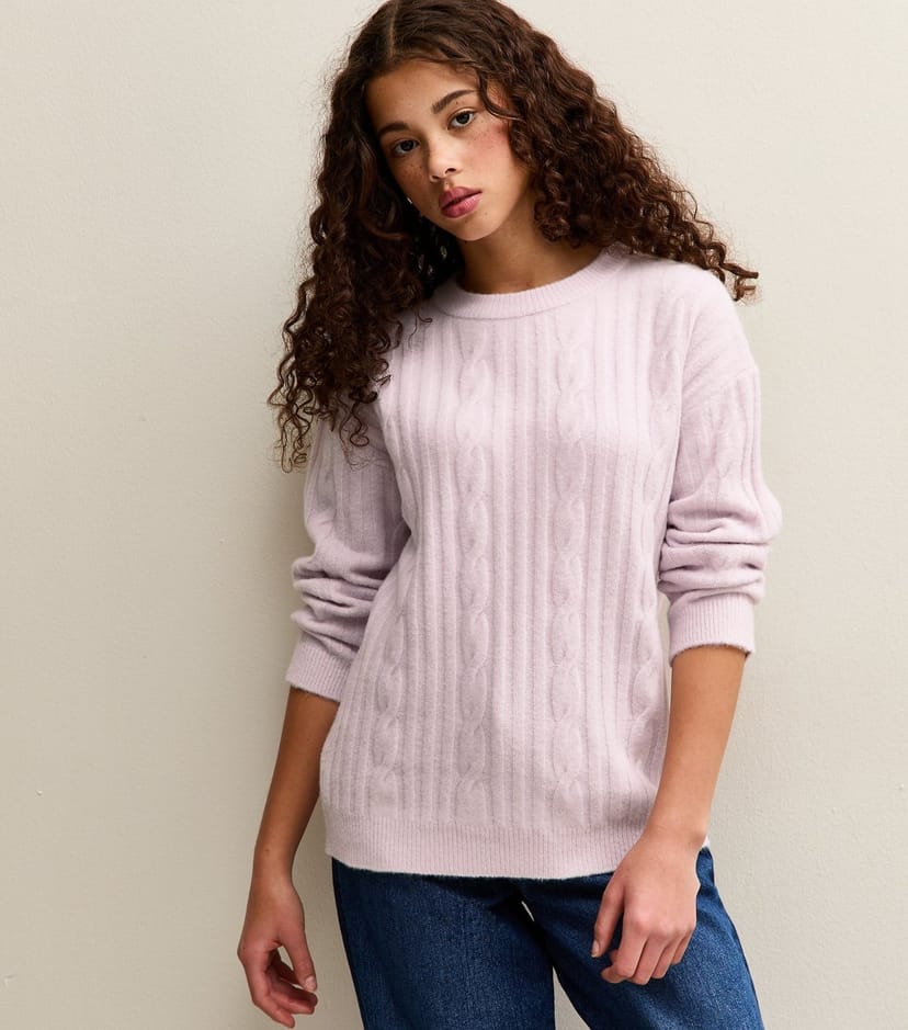 The New Look Lilac Cable Knit Jumper is available in sizes 10-11 YEARS, 12-13 YEARS, 14-15 YEARS, 9 YEARS.