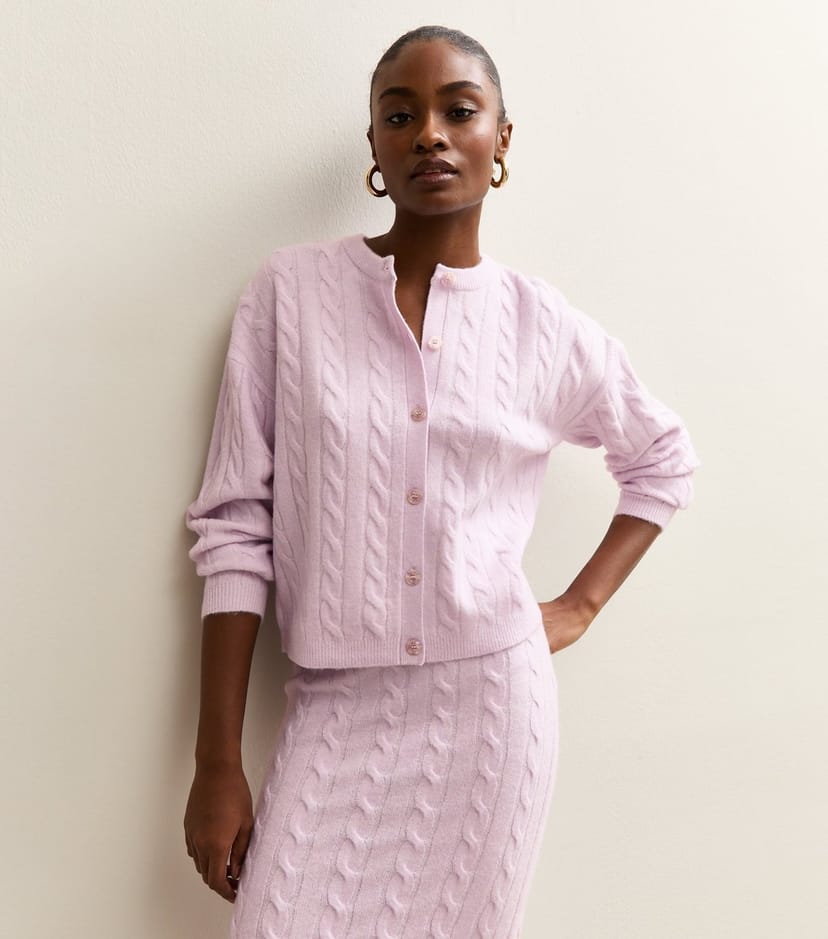 The New Look Lilac Cable Knit Cardigan is available in sizes M.