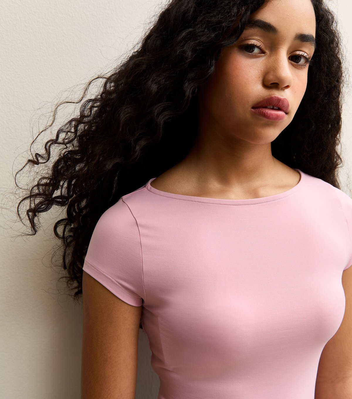 Trendy mid pink t-shirt from New Look made from slinky stretch jersey. Features a slash neckline and a cropped fit that meets the jean. Perfect for a casual, modern look.