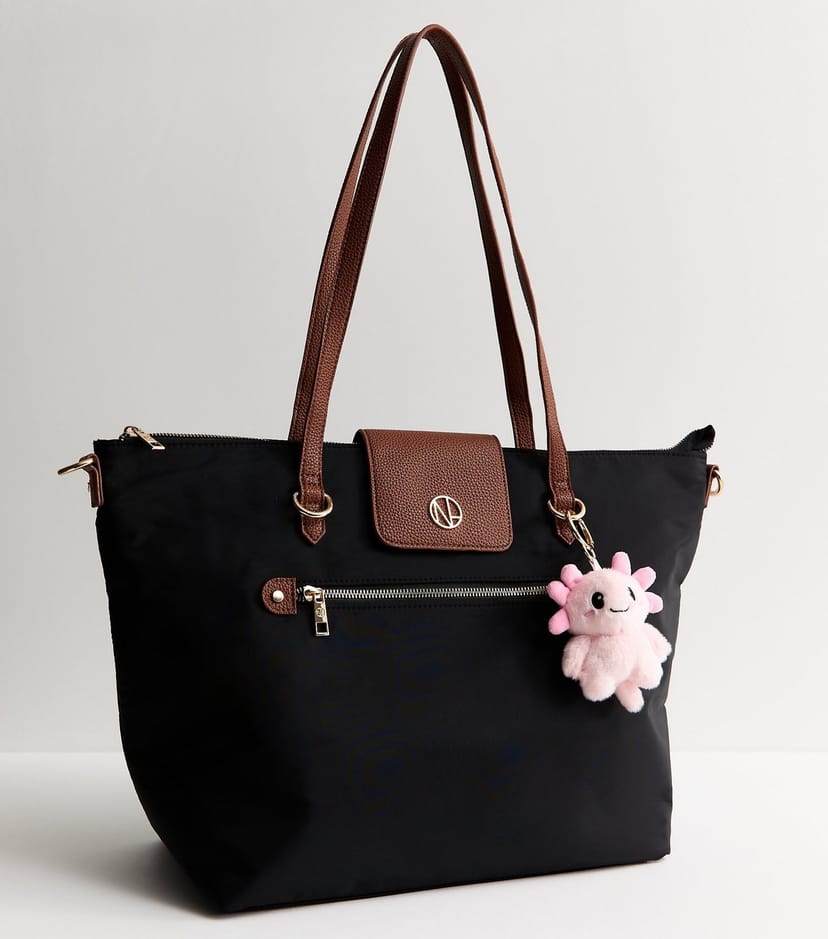 Attach the pink axolotl charm to your black tote bag for a playful and cute look.