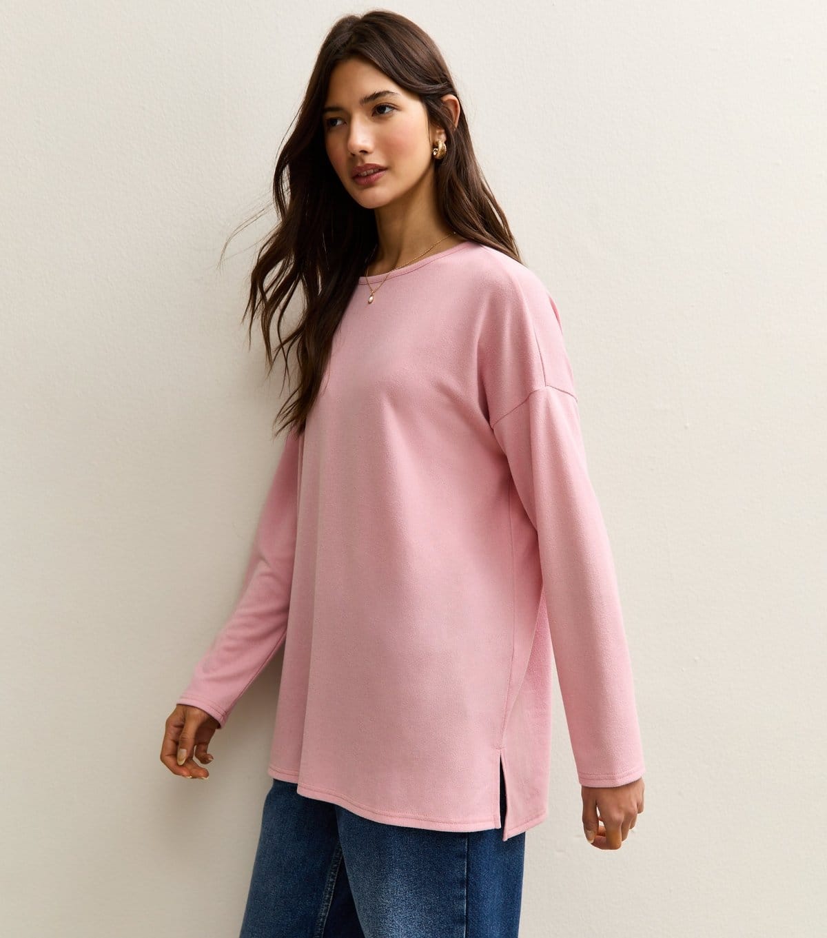 This long sleeve top features dropped shoulders and a longline hem. The mid pink shade adds a pop of colour to any look while the soft touch material ensures a comfy fit.