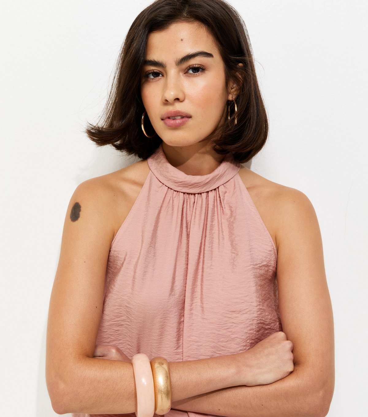 This pink bubble hem neck tie top by New Look is designed for a voluminous feel, perfect for day-to-night styling. The high neck and tie detail add a chic touch, while the bubble hem enhances its flowy silhouette.