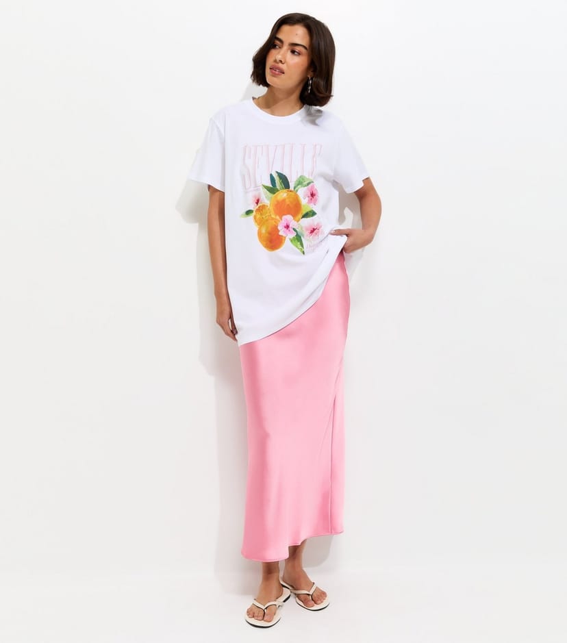 The New Look Pink Satin Midi Skirt is available in sizes 10, 12, 14, 16, 18, 20, 22, 6, 8.