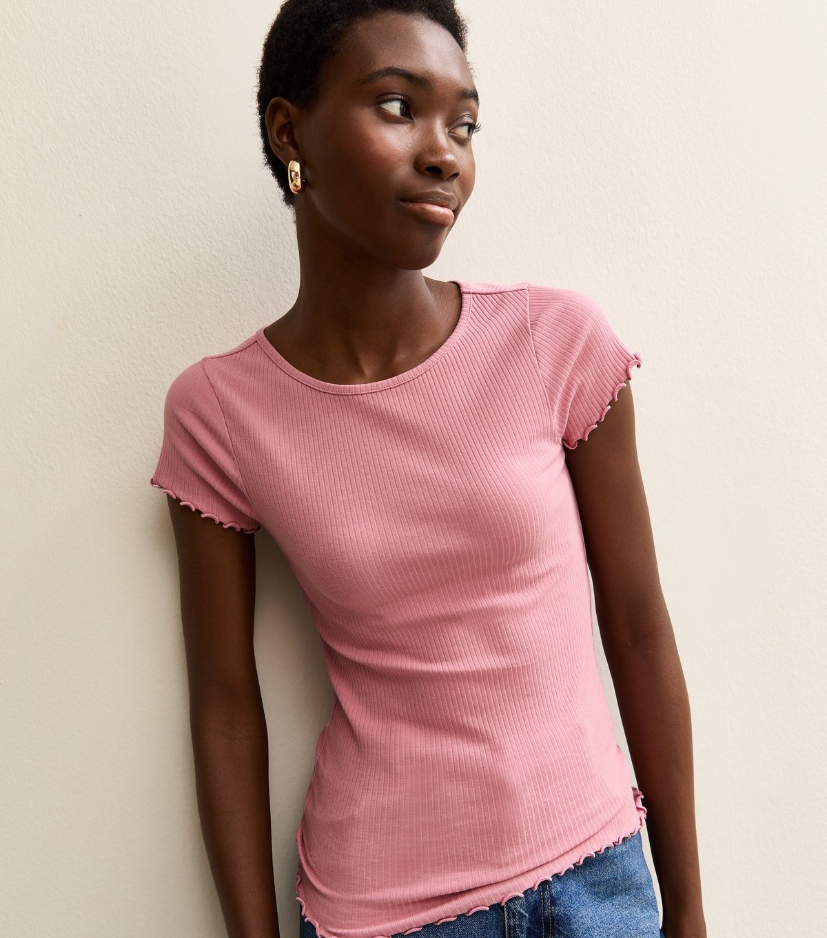 Flattering pink ribbed babylock t-shirt from New Look. Made from stretchy rib jersey, it features a crew neckline and frilly edges for a playful touch. Ideal for casual wear.