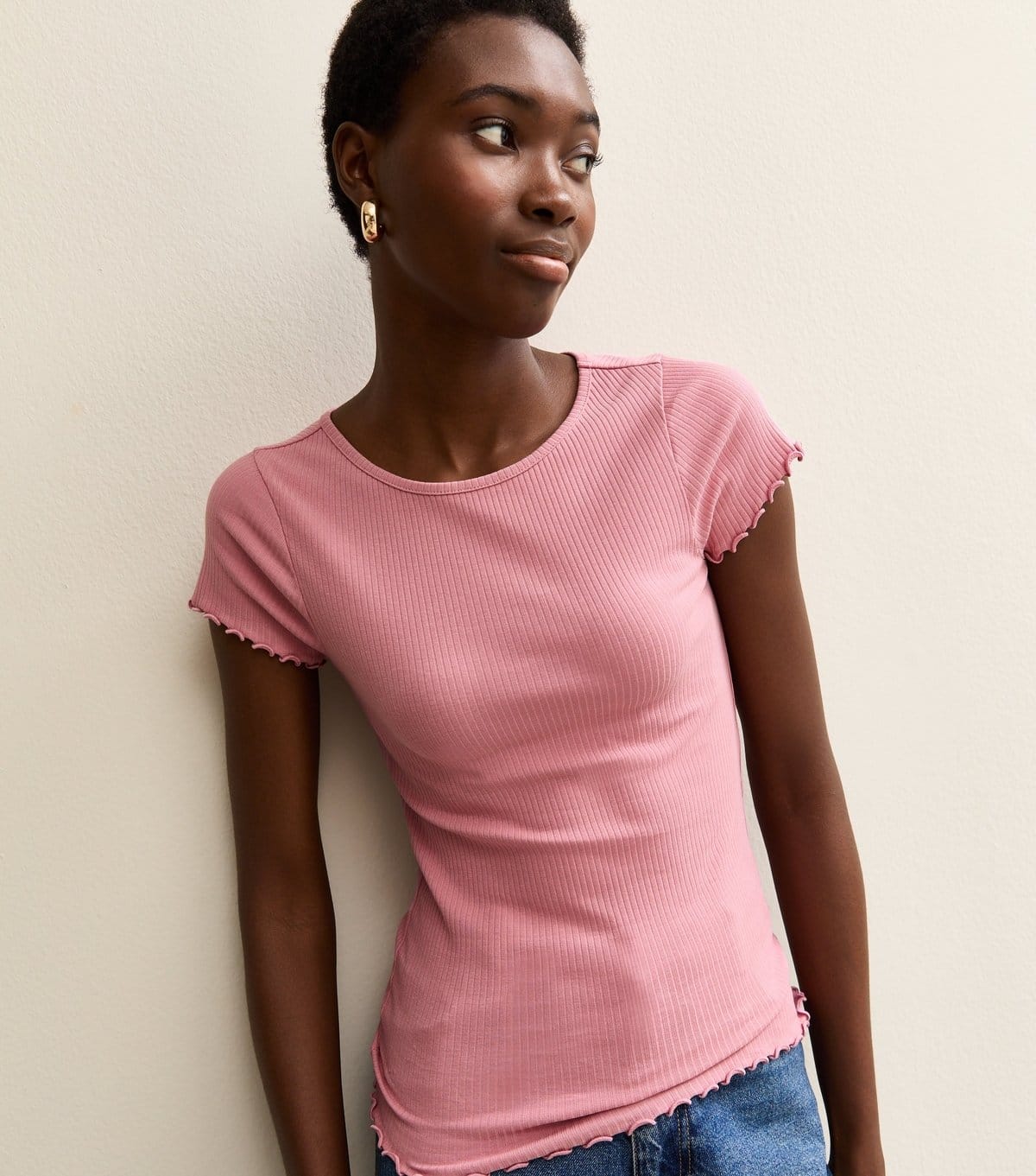 Add a pink pop to any look with this flattering crew neck t-shirt. It's made from stretchy ribbed jersey and features frilly edges for a playful touch.