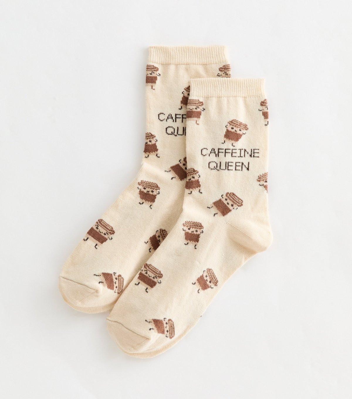 Charming ankle socks in mink featuring a playful coffee pattern and the slogan 'Caffeine Queen'. Made from knit fabric, these socks are perfect for coffee lovers.