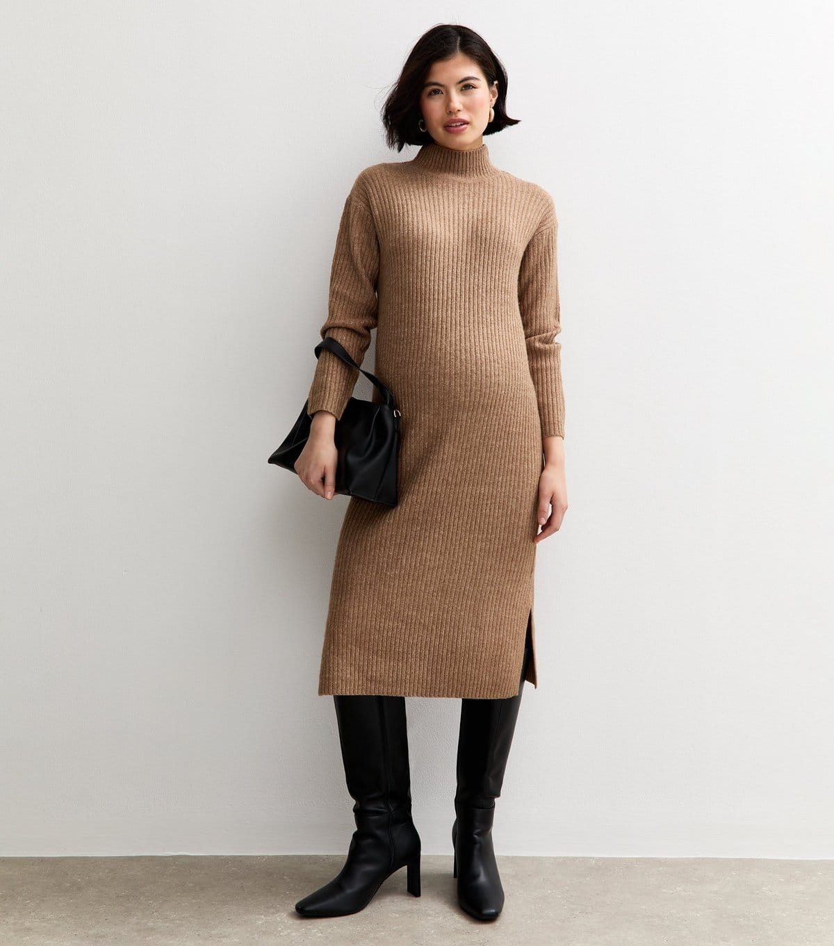 The New Look Dark Mink Rib High Neck Midi Dress is available in sizes L, M, S.