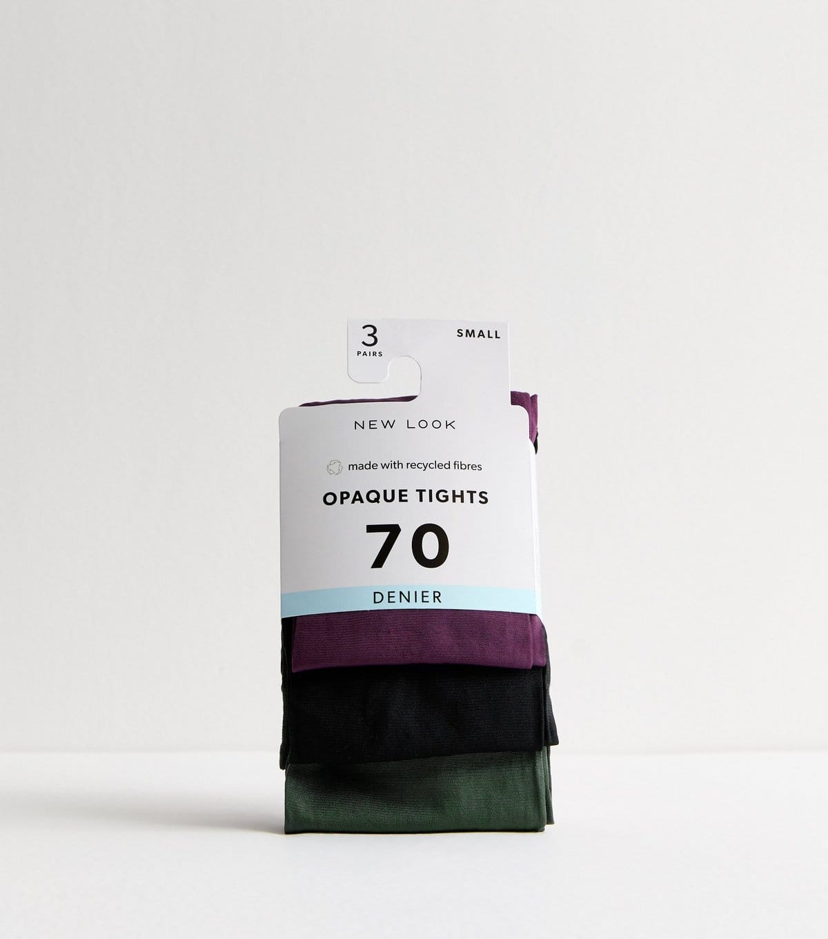 A pack of three pairs of multicoloured opaque 70 denier tights from New Look. Made from stretch fabric, these tights are perfect for everyday wear. Available in black, green, and purple.