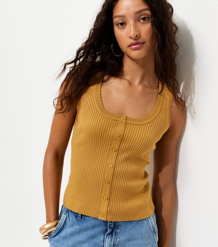 This ribbed knit vest features a preppy button-down front and scalloped neck trim. Its scoop neckline and dark yellow hue make it a great pick for sunny days.