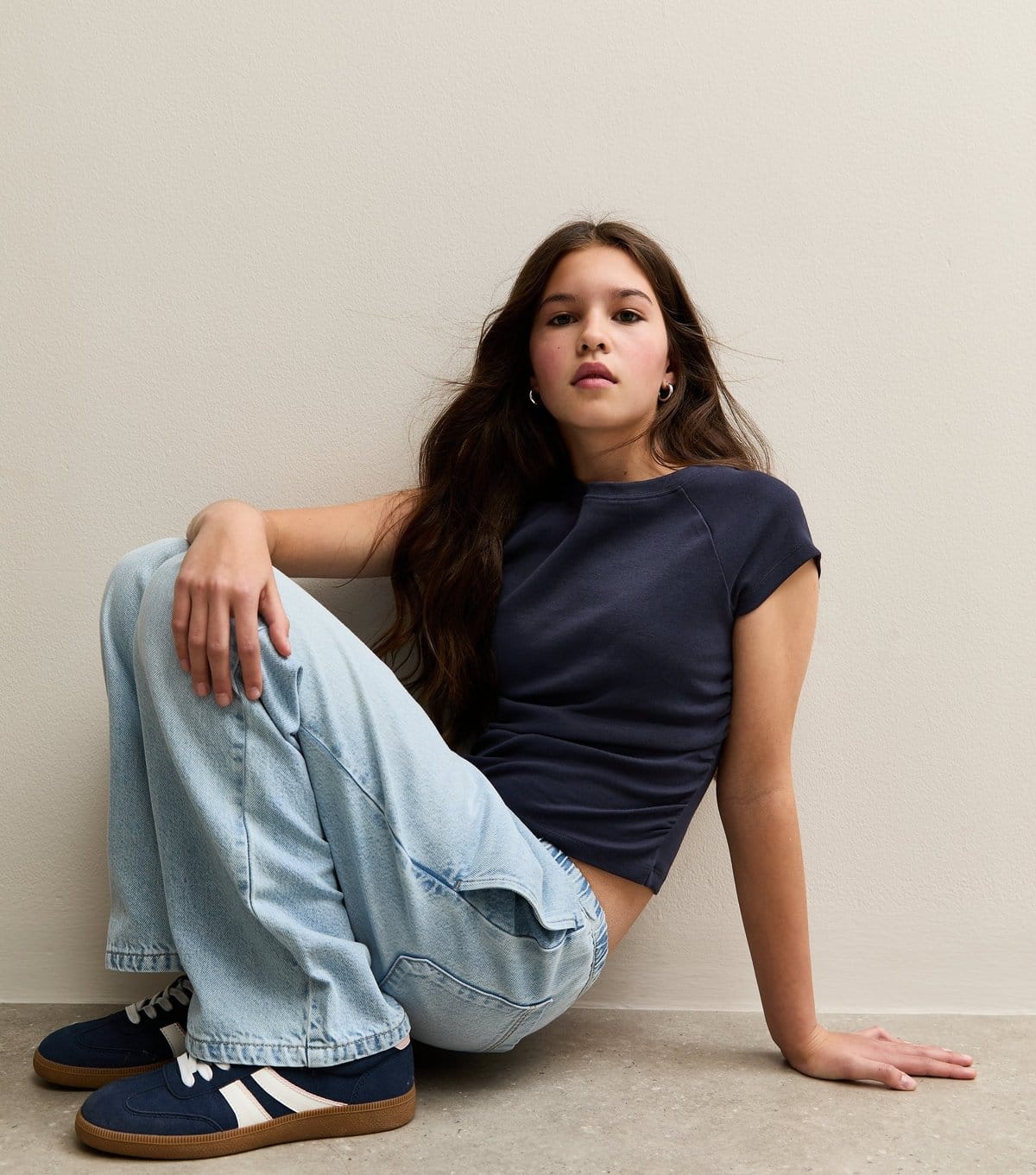 This navy T-shirt for girls from New Look is made from soft jersey fabric. It features a crew neckline, short raglan sleeves, and ruched side seams for a classic yet stylish fit. Perfect for casual wear.