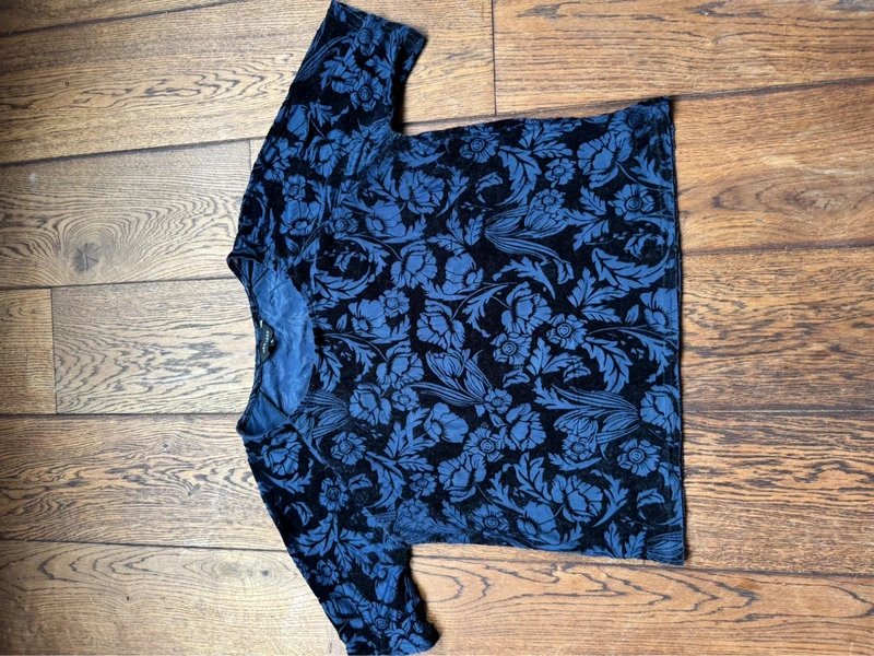 A lovely Navy light weight velvet top with an antique rose design, perfect for any occasion. Its soft texture and elegant floral pattern make it a versatile piece.