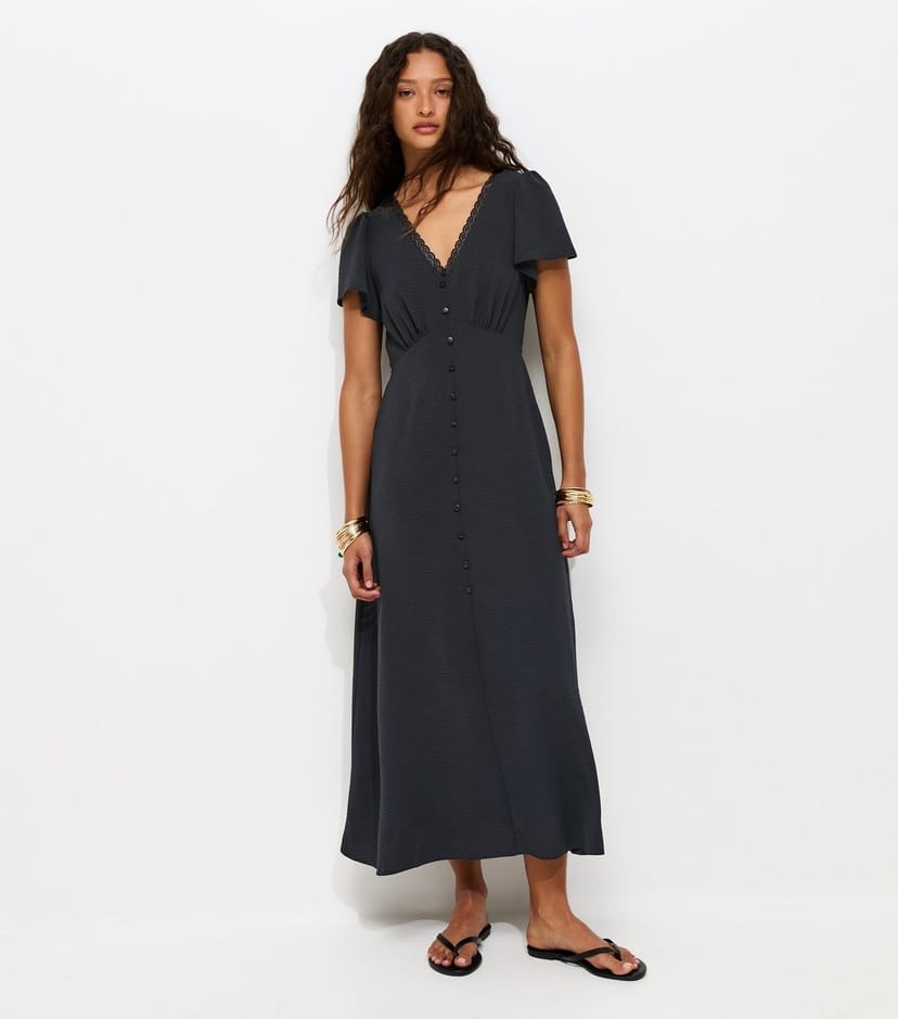 This elegant black midi dress is perfect for nights out or a sophisticated day look. It has a flattering V-neckline with lace trim and short flutter sleeves.