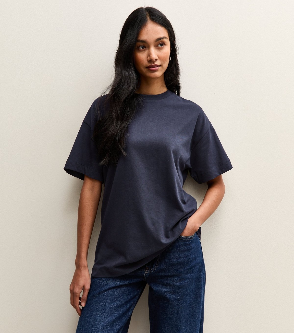 The New Look Navy Cotton Oversized T-Shirt is available in sizes 10, 12, 14, 16, 18, 6, 8.