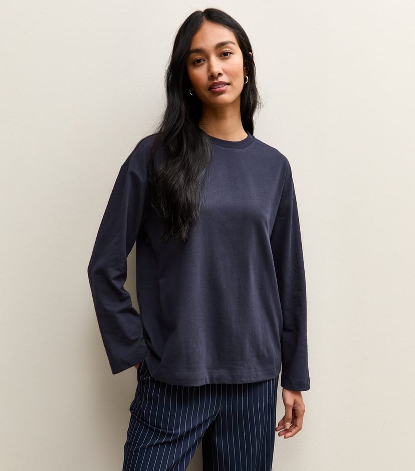 The New Look Navy Heavyweight Cotton Long Sleeve T-Shirt is available in sizes 10, 12, 14, 16, 18, 6, 8.