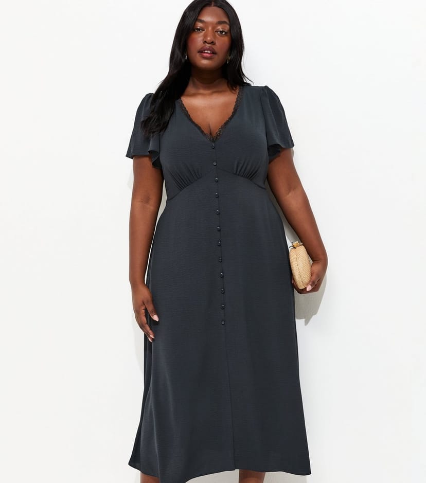 The New Look Navy Lace Trim Midi Tea Dress is available in sizes 18, 20, 22, 24, 26, 28, 30, 32.