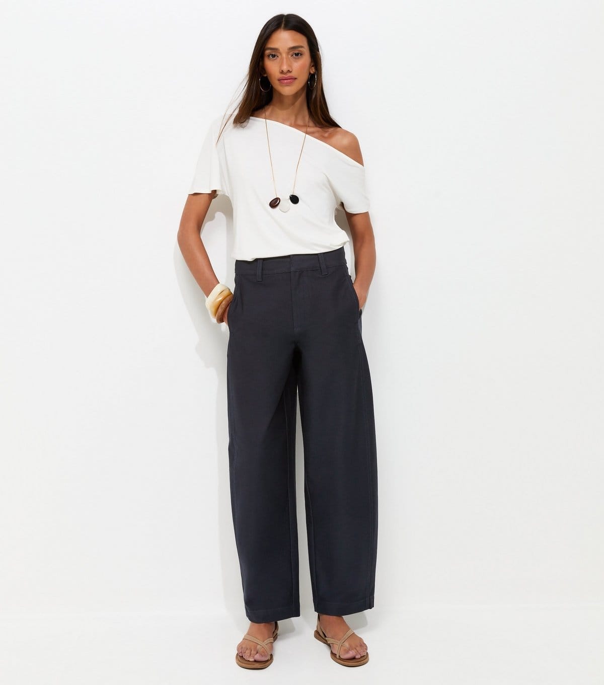 Understated sophistication meets comfort in these navy barrel-leg trousers. Perfect for weekend brunches or a casual day at the office, their relaxed fit offers endless styling possibilities.